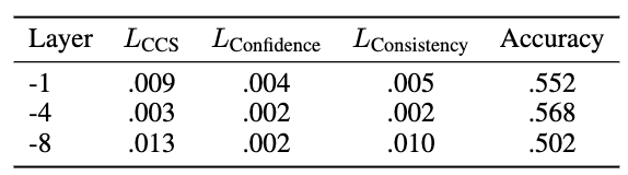 We experimented with a variety of different methods and hyperparameters. However, we found that while CCS probes were consistently able to achieve low loss according to LCCS, their accuracy was in effect no better than chance---it ranged from 50% to 57% depending on the training run. (Recall, the minimum possible accuracy for a CCS probe is 50%.) Low accuracy persisted even after we normalized the embeddings for each class by subtracting the means and dividing by the standard deviations, following the same procedure as Burns et al.