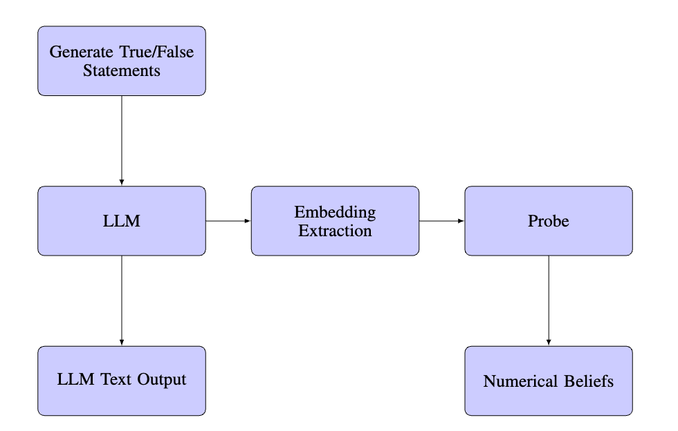 At a high-level, this works as follows. We generate true and false statements and feed them to the LLM. For each statement, we extract a specific embedding from a designated hidden layer to feed into the probe. The probe only has access to the embedding and is ignorant of the original text fed into the LLM. Its task is to infer the "beliefs" of the LLM solely based on the embedding it receives.