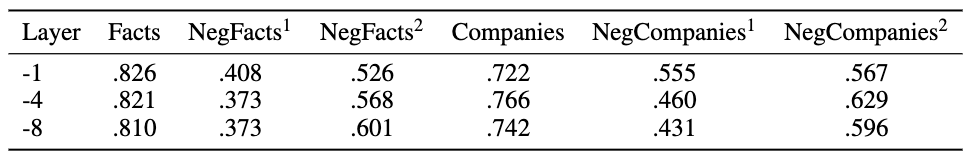 We then tested a new set of probes on NegFacts, after training on all seven original datasets (including Facts) and NegCompanies, which consisted of 550 labeled negations of statements from Companies. Thus, these probes were trained on all positive variants of the negated statements they were tested on, along with all positive examples from Companies and their negated counterparts. We did the same, mutatis mutandis with NegCompanies. Despite the expanded training data, the performance was still surprisingly poor, as shown in here:
