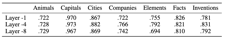 For each of the six datasets, they trained three separate probes on the five other datasets and then tested them on the remaining one (e.g., if a probe was trained on Cities, Companies, Elements, Facts, and Inventions, it was tested on Animals). The performance of these probes was evaluated using binary classification accuracy. This process was repeated for five separate layers of the model, yielding fairly impressive accuracy results overall.