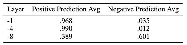 We can confirm that, despite normalization, the MLP probes were able to determine which embeddings corresponded to positive and negative examples in layers -1 and -4 by checking the average values the probes returned for members of each class. Probes found some other way to achieve low loss in layer -8, but they did not do any better in terms of accuracy. (Recall, only roughly half the positive examples and half the negative examples are actually true.)
